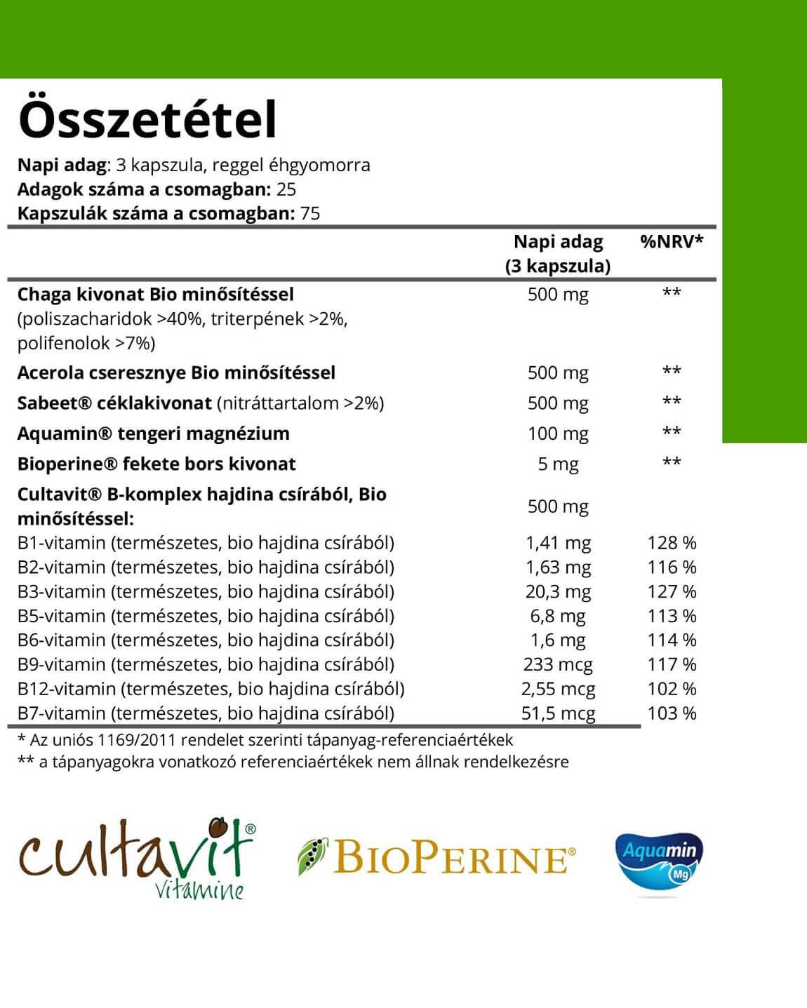 A chagából származó béta-glükánok és az acerola természetes C-vitaminja aktiválják az immunrendszert, és csökkentik az oxidatív stresszt. Ezáltal védik a sejteket a korai öregedéstől, és erősítik a szervezet védekezőképességét.